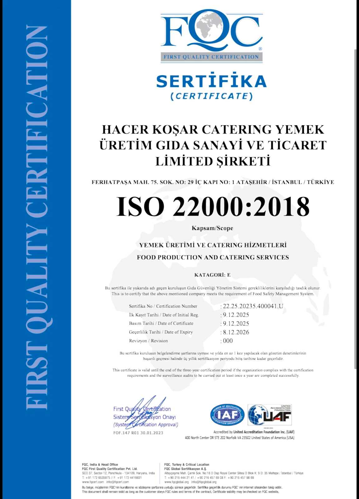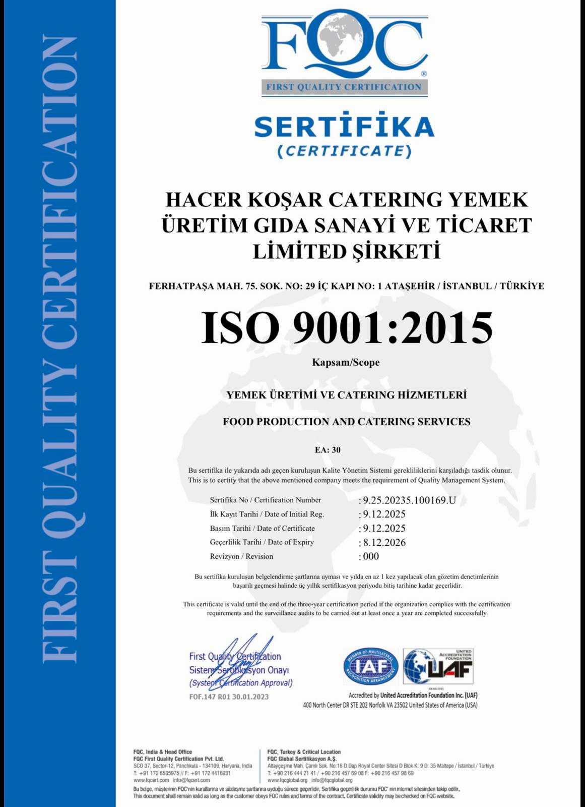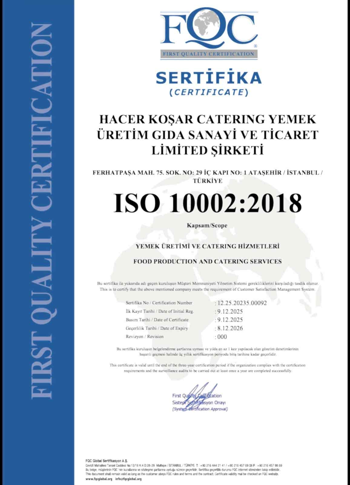 Gıda Üretim İzin Belgesi, Gıda Sicili, ISO 9001 Kalite Yönetim Sistemi, ISO 22000 Gıda Güvenliği Yönetim Sistemi (HACCP), TSE Hizmet Yeterlilik Belgesi, İşyeri Açma Ruhsatı ve İşletme Belgesi gibi önemli belgelere sahiptir.